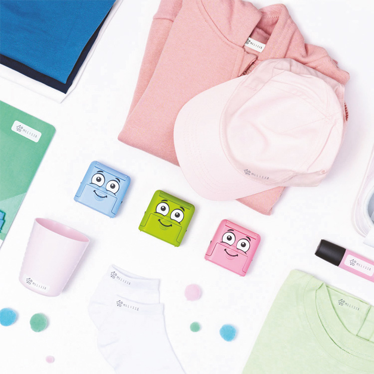 kartonsko embalažo in vsebuje štampiljko s prijaznim smeškom, termo trak za označevanje temnih tkanin ter etikete, ki so primerne za pomivalni stroj.