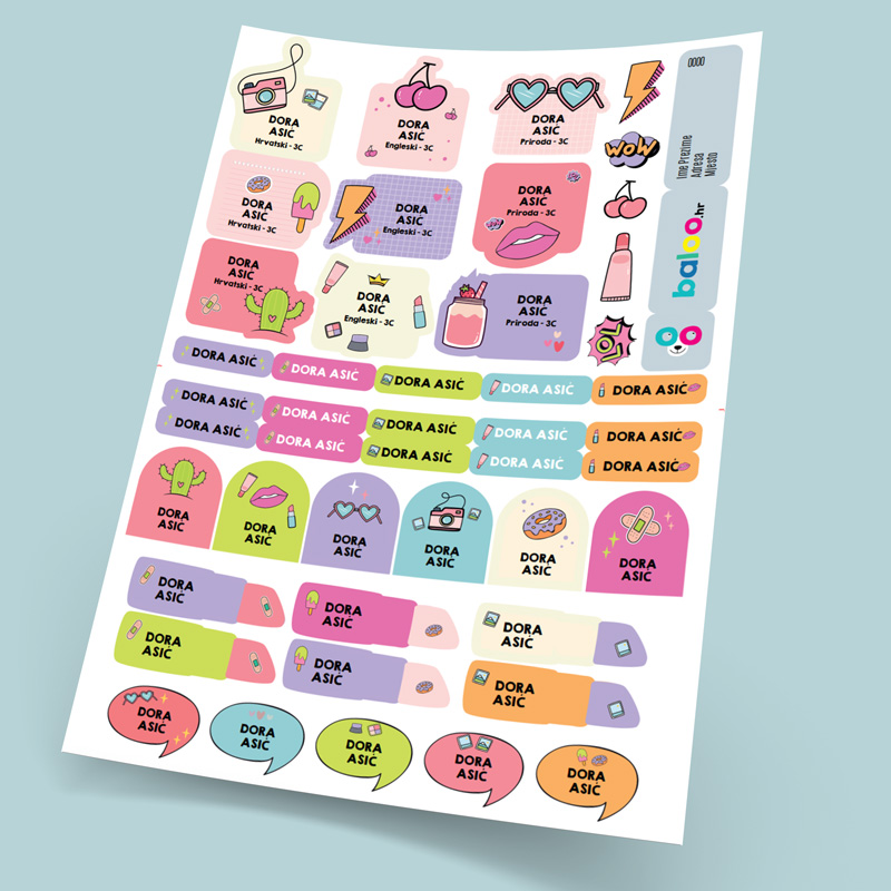 Paket ŠKOLARAC S sadrži 164 personaliziranih naljepnica s imenom u pet različitih veličina i oblika – idealne za bilježnice, pernice, bojice, obuću i sve ostalo što djeca svakodnevno nose u školu.