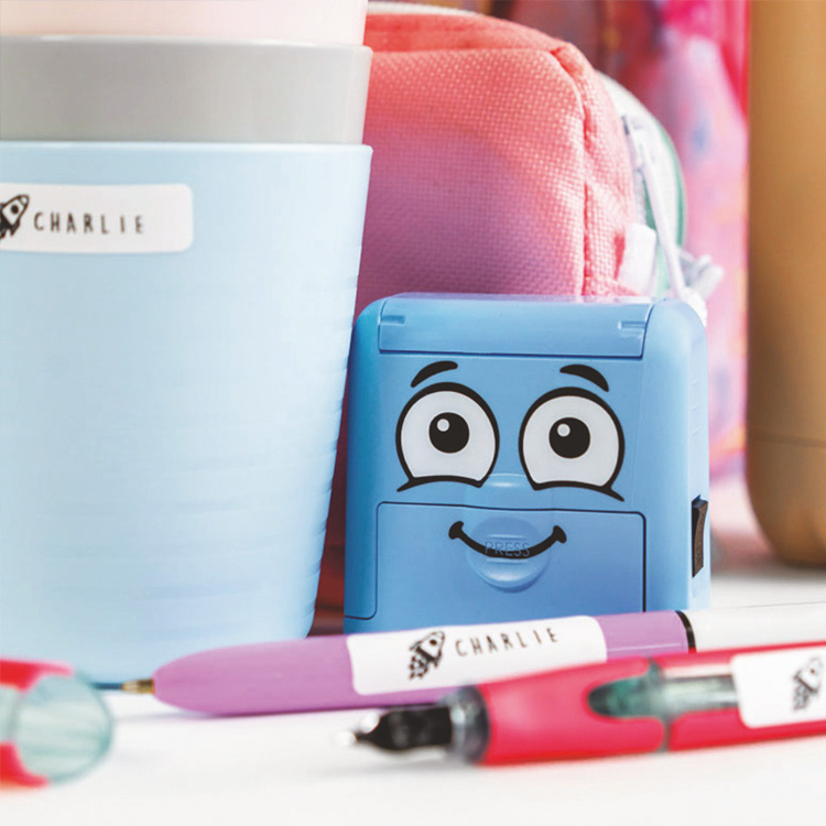 kartonsko embalažo in vsebuje štampiljko s prijaznim smeškom, termo trak za označevanje temnih tkanin ter etikete, ki so primerne za pomivalni stroj.